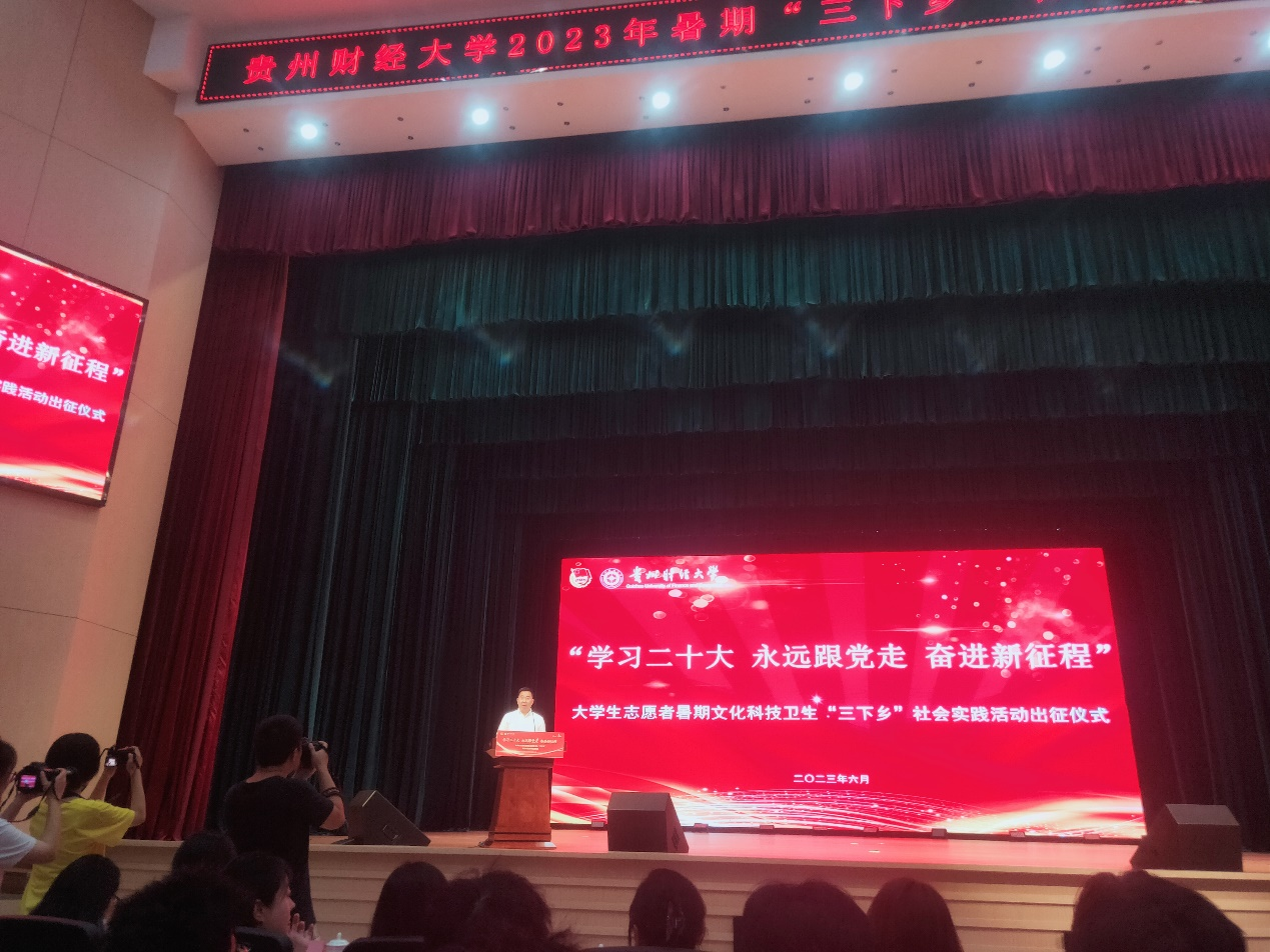 为激发青年学生爱党爱团热情,展示积极向上的青春风采,动员我校青年学生积极投身乡村振兴实践当中,贵州财经大学于2023年6月30日8:00在学生活动中心大礼堂隆重举行了“大学生志愿者暑期文化科技卫生‘三下乡’社会实践活动出征仪式”,校党委副书记朱克乾出席本次出征仪式并做讲话,香港博彩网站 由团委彭梦娜老师和“经心筑梦团”全体实践队员积极参与其中。