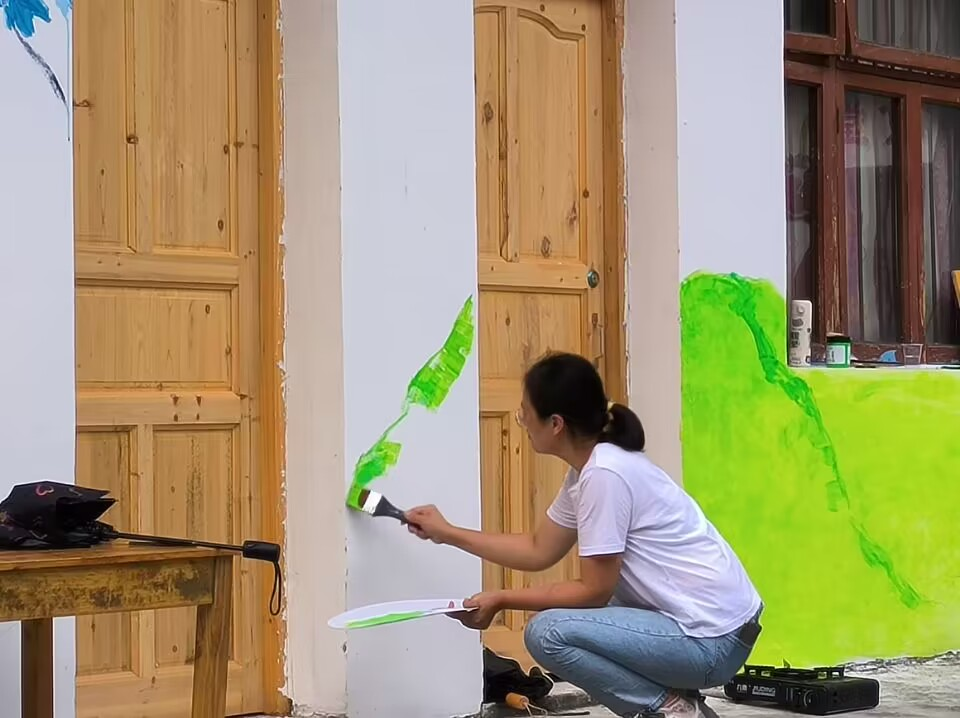 杨志远老师的带领下,志愿者们对村委新办公楼进行墙绘装饰,绘画围绕环境保护、和美乡村、和谐乡风等主题展开,有效改善了村委会风貌,使老旧的办公楼呈现新貌。