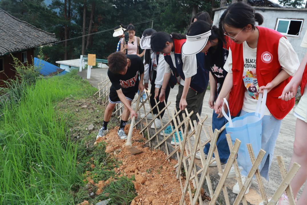 活动第二项为“庭院美化”,志愿者们在各个村寨标志性场所清除垃圾、杂草,安装竹栅栏,播撒花种,播种希望,畅想着不久之后当地村民能够开窗见绿,推门闻香。