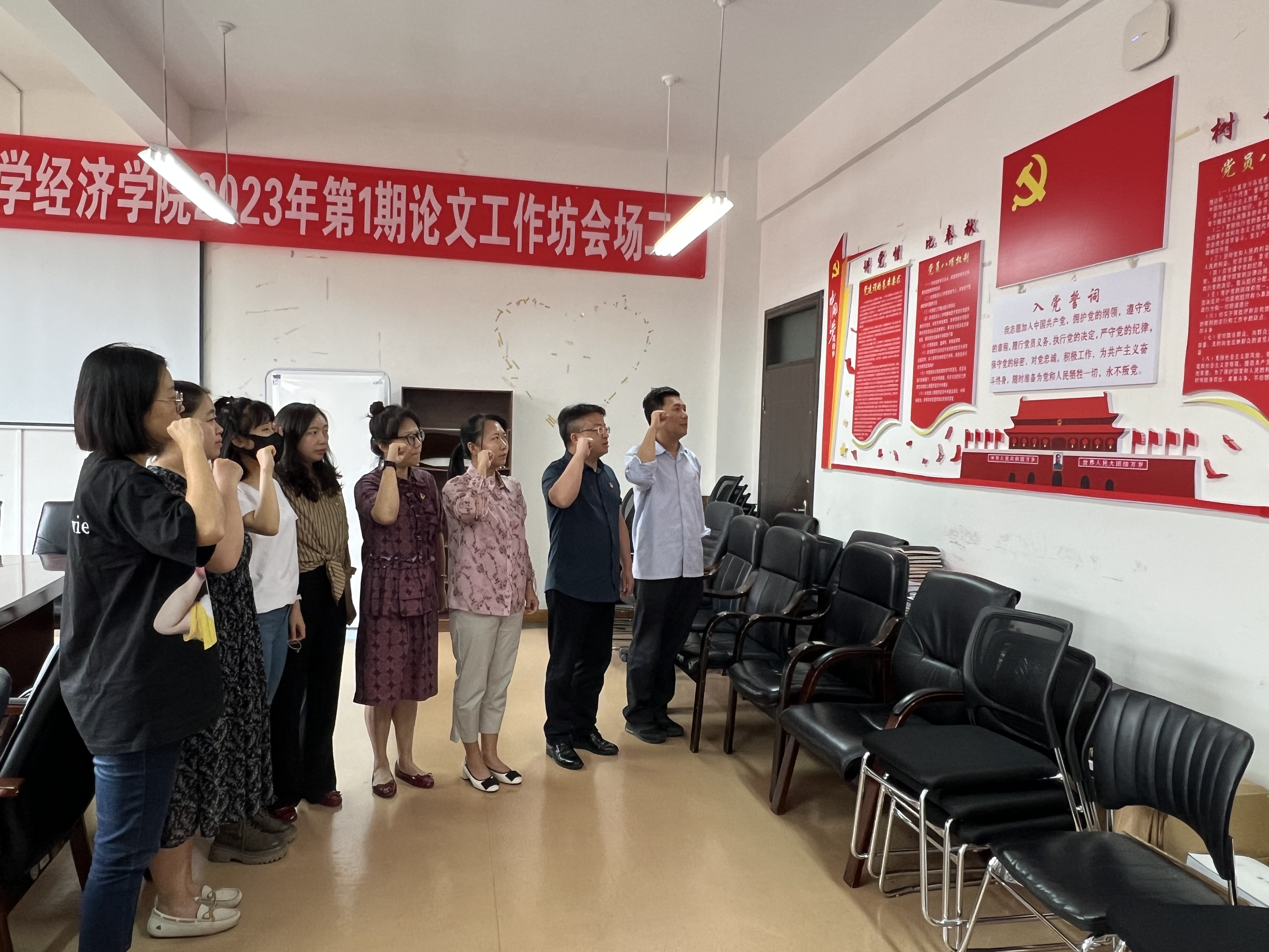行政教工党支部在支部书记赵之友带领下围绕《党章》开展专题学习讨论,同时引申学习了解入党誓词背后的故事,带领支部党员开展重温入党誓词主题党日活动。
