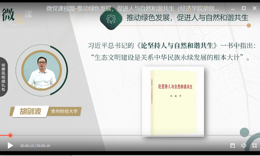 人口资源与环境经济学系教工党支部围绕“推动绿色发展,促进人与自然和谐共生——两个生态文明建设案例分享”为题开设“微党课”讲授,要求支部全体党员教师清醒认识保护生态环境、治理环境污染的紧迫性和艰巨性。