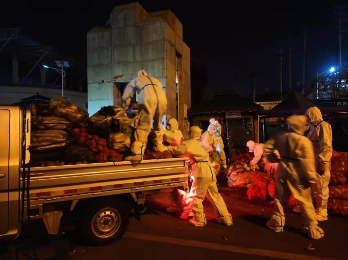副书记赵之友同志带头发挥党员先锋模范带头作用,第一个报名,带领周文、彭伟辉老师立即投入到学校南二门后勤物资保障装卸组蔬菜卸载现场,由于是招募第一天人手不够,彭梦娜、杨志远两位女老师路过,也毫不犹豫卷起袖子挽起长发加入了搬运队伍,首战完成了25000斤的蔬菜瓜果卸载任务。随后,学院一线教师王保谦、杨重玉、廖从健、王太盈、李勇刚、张连华、邓金虎、王世尧、贺红兵老师,还有我们新入职的科研助理胡国磊、王永胜、聂旗、陆毅纷纷主动请缨补充到志愿者队伍。他们当中有刚完成线上教学后看到群里急缺人手马上跑到现场支援的,还有刚完成蔬菜物资卸载又即刻投入桶装水搬运的。夜幕下,正是有了这样一些爱心助力者,保障了物资从校门到食堂、到办公室、到超市、到我们手中的最后一公里路程。