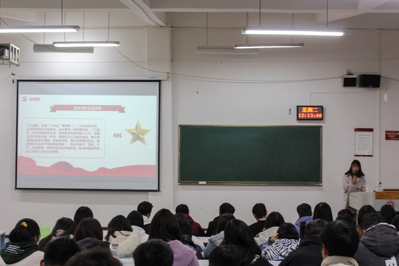 李菁菁老师首先为同学们做了十九届五中全会精神解读,并回顾了“十三五”规划在决胜全面建成小康社会取得的十方面决定性成就;接着,作为我校参加省学联第九次代表大会青年代表之一的18级经济学班的胡泽欢同学,带领各同学和学生干部们认真学习省学联第九次代表大会系列讲话精神。省委书记谌贻琴在贺信中指出,党的十八大以来,以习近平同志为核心的党中央高度重视青年工作,我们要切实增强“四个意识”,坚定“四个自信”,坚决做到“两个维护”,牢记嘱托、感恩奋进,推动新时代党的青年工作迈上新台阶。谌贻琴书记并期望全省青年和青年学生深学笃用习近平新时代中国特色社会主义思想,坚定理想信念,培育高尚品德。省委副书记蓝绍敏的讲话中,给全省广大青年朋友提出了四点希望,希望各青年加强政治历练,做听党话跟党走的“有志青年”;希望加强实践锻炼,做见世面经风雨的“实干先锋”;希望加强专业训练,做能创新敢创造的“奔腾后浪”;最后希望青年朋友加强思想淬炼做既成长又成才的“时代新人”。