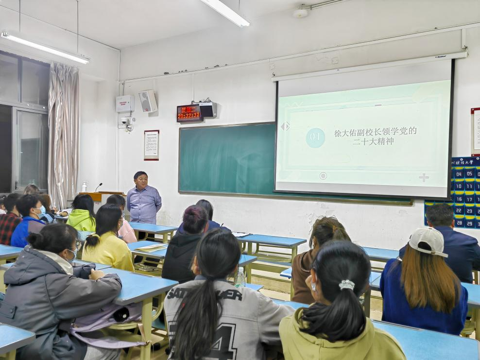 首先,徐大佑副校长指出党的二十大主题是高举中国特色社会主义伟大旗帜,全面贯彻新时代中国特色社会主义思想,弘扬伟大建党精神,自信自强、守正创新,踔厉奋发、勇毅前行,为全面建设社会主义现代化国家、全面推进中华民族伟大复兴而团结奋斗。