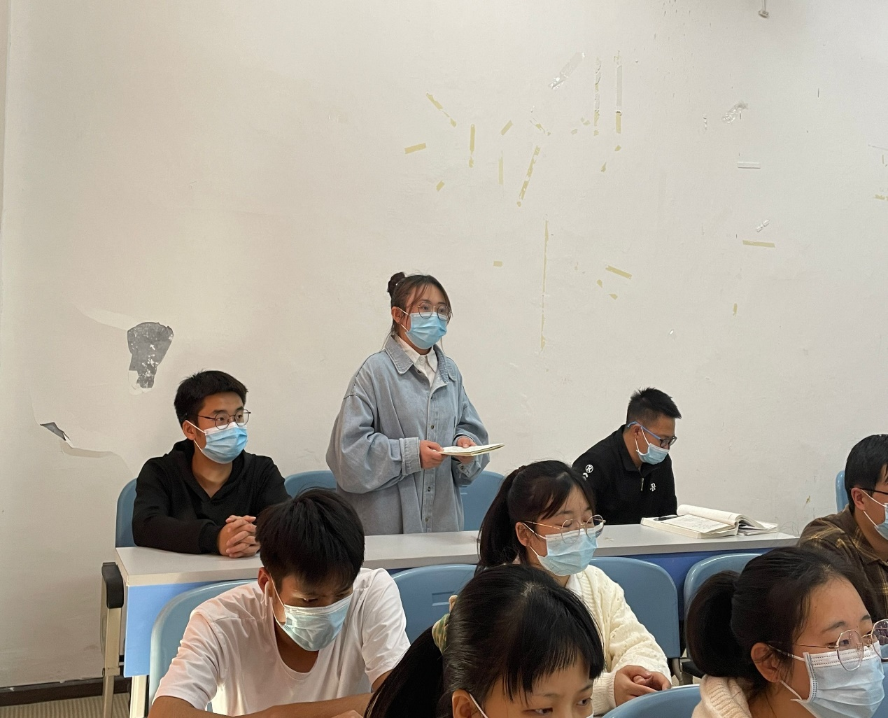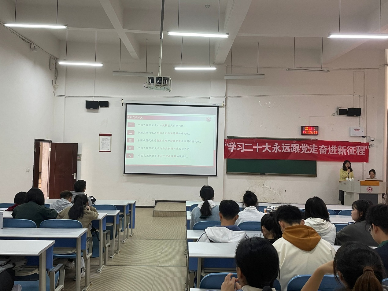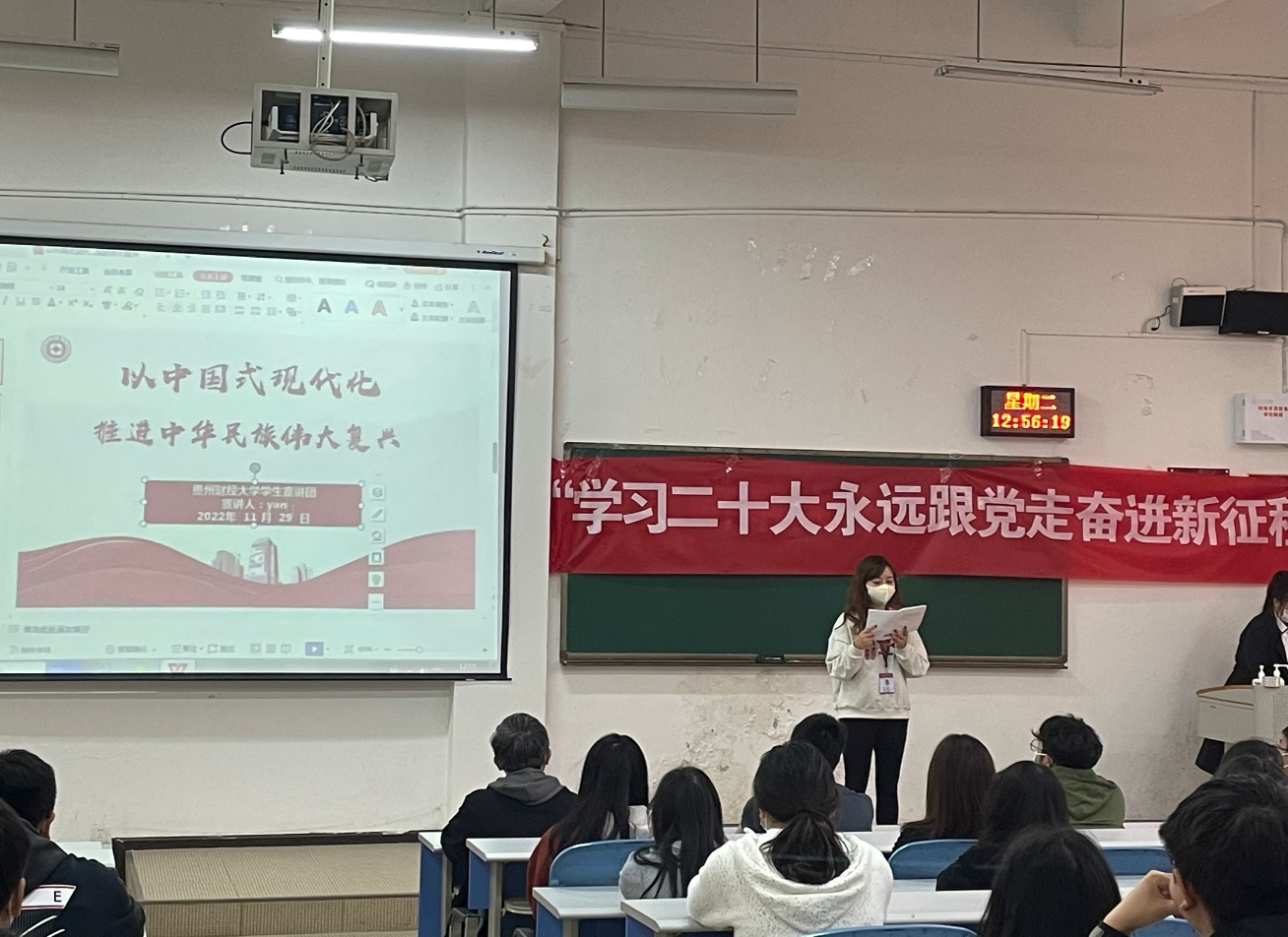 其次,在宣讲会上,宣讲员王宏迷向大家介绍了党的二十大报告以全面建设社会主义现代化国家为主线,对高质量发展进行布局,围绕科技、教育、人才的发展战略,全过程人民民主的发展,法治建设,文化强国建设,生态文明建设,推进共同富裕等方面展开了一系列的重要论述。接着,各班组织同学进行发言。