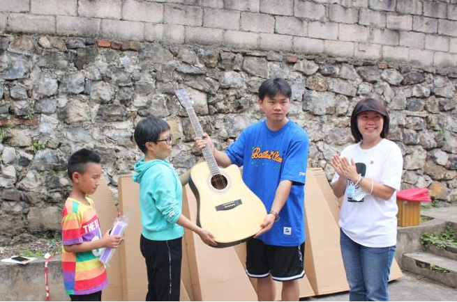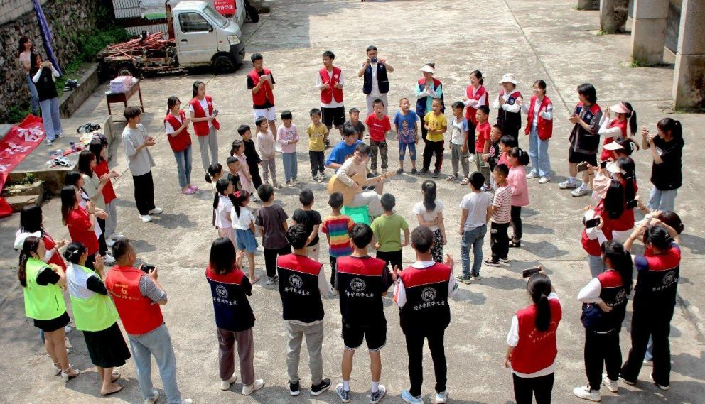 “经心筑梦团”成员和两位“萌芽音悦”项目团队负责人参与此次公益活动。首先,“萌芽音悦”项目的两位负责人演奏吉他,志愿者与孩子们一起合唱歌曲《孤勇者》。合唱结束后开展了老鹰捉小鸡、兴趣话谈、音乐课堂等活动环节,拉近了志愿者与孩子们的距离,让孩子们初步了解乐器的基础知识和弹奏方法。活动最后,志愿者们给孩子们捐赠了十把吉他,助力乡村音乐教育。