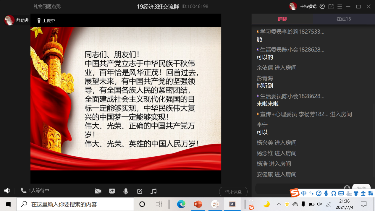 各团支部通过线上观看庆祝中国共产党成立100周年大会视频或阅读相关新闻报道的形式,深入学习习近平总书记重要讲话精神,并积极讨论交流心得体会。通过学习,同学们纷纷表示,作为新时代青年学子,要牢记习近平总书记殷切嘱托,勤奋学习、砥砺奋进,在党的领导下,为实现中华民族伟大复兴的中国梦,为社会主义现代化建设贡献自己应有的一份力量!