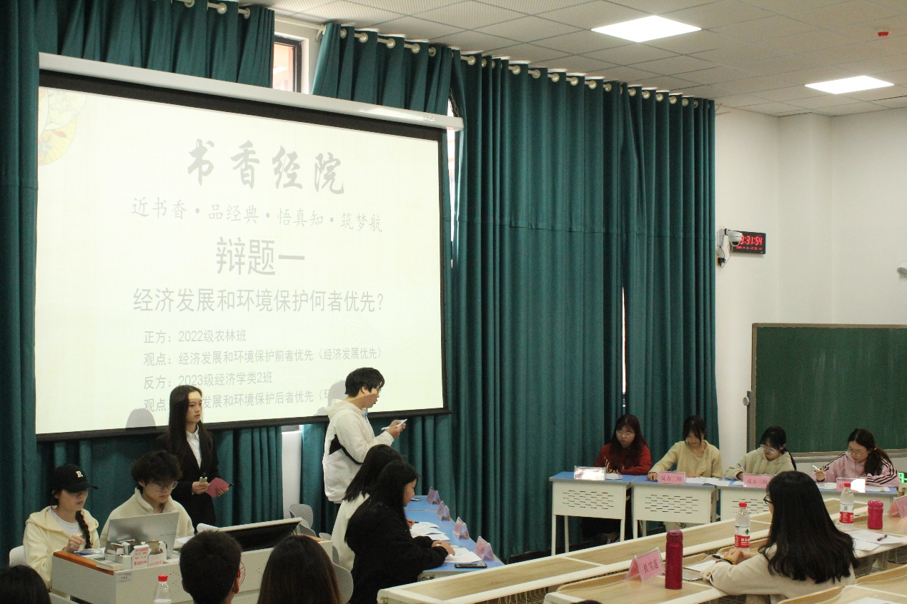 紧接着是第二项比赛,“百家争鸣”辩论赛。辩题一:经济发展和环境保护何者优先;辩题二:我国发展经济应不应该鼓励提前消费。“是先有地球才有人类,我们是地球的保护者而不是拥有者”。辩手的发言引人深思,他们不仅拥有丰富的词汇和流利的口才,还能够在激烈的辩论中保持冷静的头脑。他们的辩论犹如一场没有硝烟的战争,让观众们感受到了他们无穷的力量和才华。评委老师结合辩题以及时代背景对各位辩手的精彩辩论进行总结点评,给出建议。