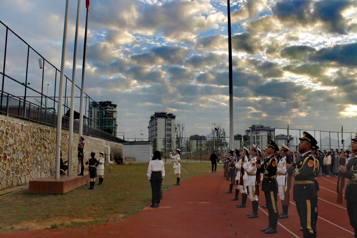 仪式开始,国旗护卫队队员身着整齐制服,迈着铿锵有力的正步护送国旗入场,挺拔的身姿与整齐的队列,赢得在场师生的无声敬意。雄壮的《义勇军进行曲》响彻体育场,全体师生肃立,目光追随着冉冉升起的五星红旗,爱国情怀在歌声与旗帜飘扬中深深激荡。