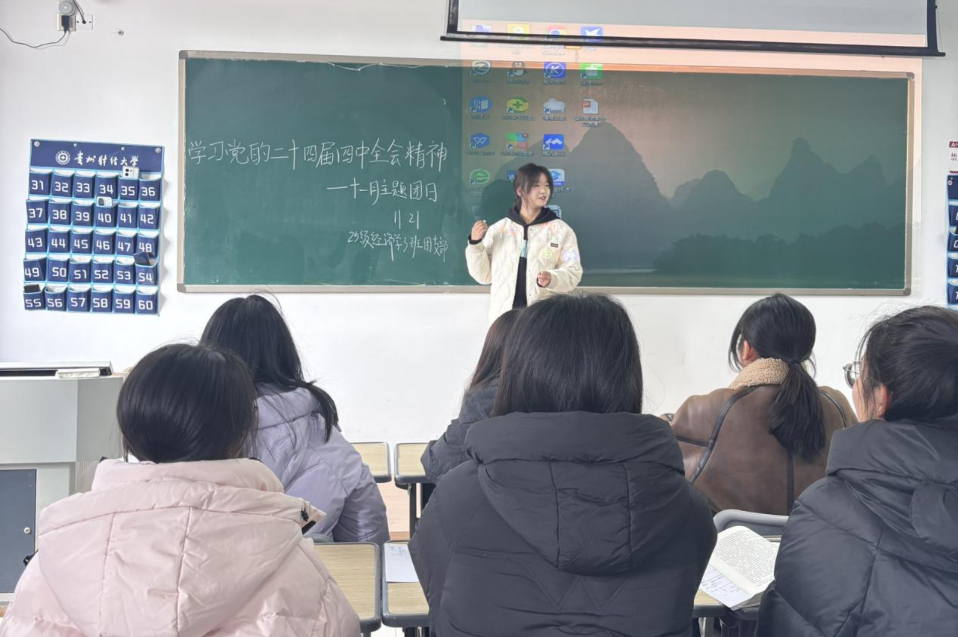 在专题研讨环节,2023级经济学1班团支部聚焦“高质量发展与科技自立自强”,探讨如何通过专业学习夯实数据分析、政策研究等核心能力,为数字经济、绿色经济发展贡献智慧;2024级资源与环境经济学班团支部围绕“生态产品价值实现+绿色发展实践”两方向交流,结合专业特色与全会精神精准对接;2025级农林经济管理班团支部通过“粮食安全保障+农业农村现代化+乡村产业融合”三大核心方向进行交流分享,明确专业在农业科技成果转化中的桥梁作用。同学们纷纷表示,要将个人理想融入国家发展大局,在学业精进中锤炼过硬本领,在实践奉献中践行青春承诺。