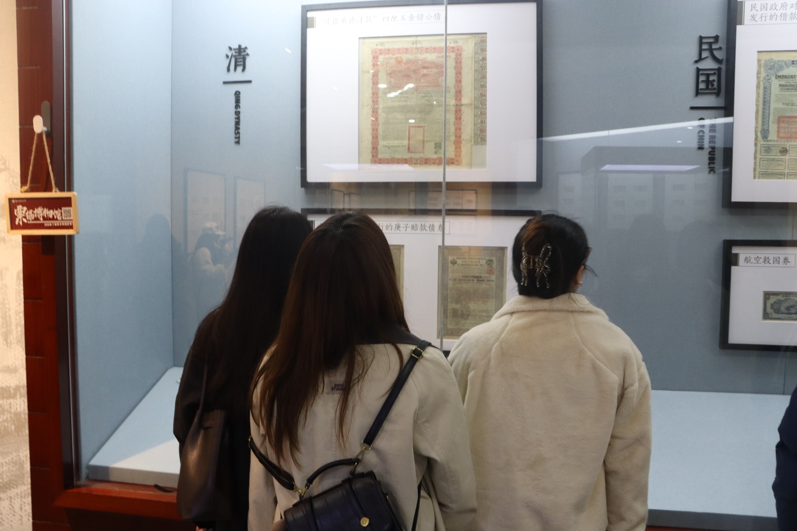 步入票据馆,千余年跨度的票据藏品系统铺展:从元明时期的通行宝钞到革命年代的红色借谷证,从计划经济时期的粮票、布票到改革开放后的股票、债券,一张张泛黄的票据串联起中国经济发展的鲜活轨迹。在讲解员的专业引导下,同学们驻足凝视、细致研讨,尤其对贵州本地存款券、脱盲证等特色藏品表现出浓厚兴趣。这些兼具乡土气息与时代特征的票据实物,直观呈现了经济活动与民生福祉的深度绑定,让抽象的经济原理有了可触可感的现实载体。