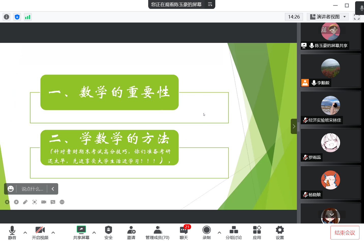 举办了主题为“优秀学长讲大一高数学习方法与心得”的线上讲座和交流活动,邀请到2020级经济学实验班的陈玉豪同学主讲,香港博彩网站