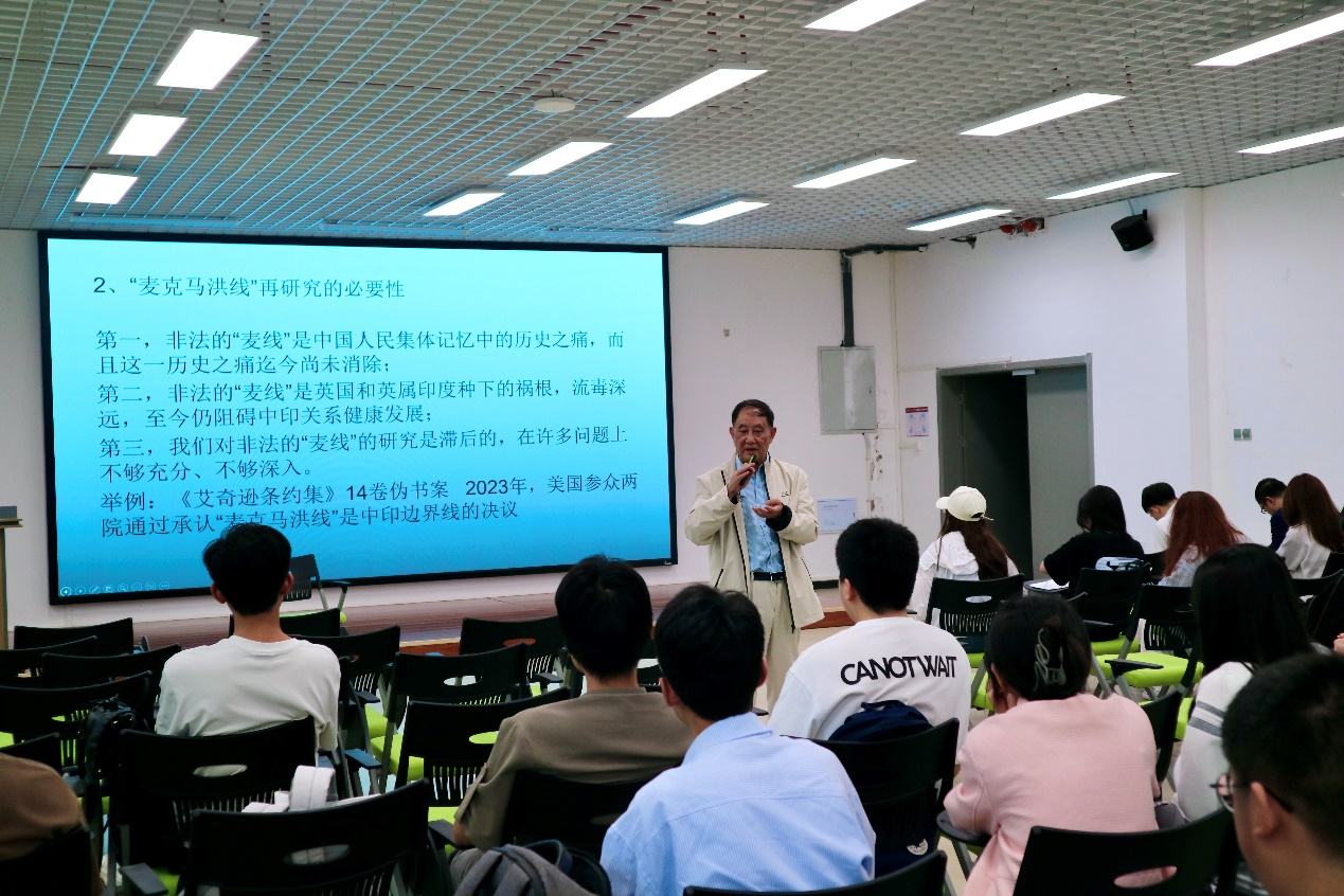 讲座中,吕昭义教授围绕“麦克马洪线”与当前中印边界问题的新趋向这一主题展开讲解,并从“麦克马洪线”的由来、中印边界问题的演变以及当前中印边界问题的新趋向进行论述。吕昭义教授表示,提升我国中印边界战略管控能力对于维护我国领土主权,排除干扰,推进国家发展具有重要的战略意义,是目前我国国防建设的一项重要任务。