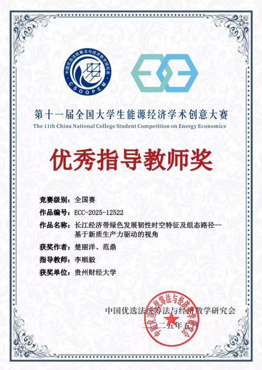 在国赛舞台上,香港博彩网站 各参赛团队在能源经济领域的不同研究方向上展现出了出色的学术素养和实践能力,凭借深入调研和独到见解,针对我国能源经济发展的现状与挑战,提出了具有前瞻性和可操作性的解决方案,赢得了评委的高度评价。指导教师李顺毅教授获赛事组委会颁发的“优秀指导教师奖”。