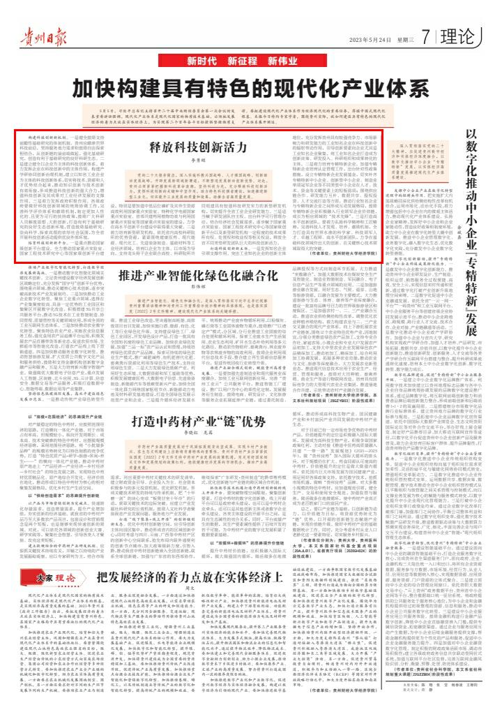 (来源:《贵州日报》理论版)党的二十大报告提出,深入实施科教兴国战略、人才强国战略、创新驱动发展战略,开辟发展新领域新赛道,不断塑造发展新动能新优势。对此,贵州必须紧紧把握新科技革命浪潮,坚持科技为先,充分释放科技创新活力,发挥科技创新的关键和中坚作用,助力特色科技强省建设,加速推进新型工业化,切实提升工业发展的质量和效果,助推全省高质量发展。