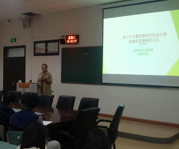 单晓娅教授首先从解读十九大报告中新时代生态文明的建设着手,强调坚持人与自然和谐共生是新时代坚持和发展中国特色社会主义的基本方略之一,指出良好的生态环境是最公平的公共产品、是最普惠的民生福祉。随后单晓娅教授结合贵州省实际,围绕“绿色创新”这一主线,分别阐述了贵州生态文明建设存在的主要问题和战略方向,强调在守住发展和生态两条主线的基础上,需要正确处理发展和生态环境保护的关系,保证总体定位恰当、地方特色突出,争取实现全国示范性效应。