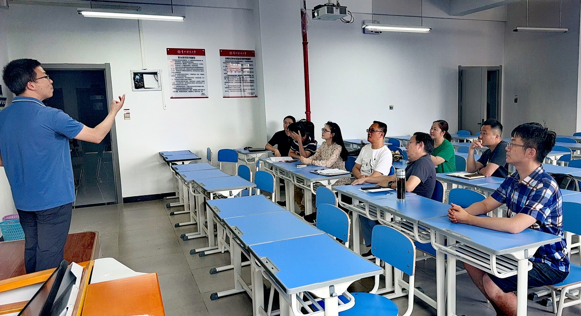 听课专家组由学院分管领导、系副主任和督导组老师组成。各系对此项工作非常重视,按照学校的要求组织老师认真备课,梳理完善教学大纲、教案、课件、教学进度表等教学要件。每位老师授课时间为45分钟,现场进行课堂展示,并针对课程思政和数字化(AI)教学进行了交流学习,很多教师现场分享自己课程思政的经验以及学习通、雨课堂等教学软件的使用心得,呈现出良好的教学风范,活动开展效果较好,达到“以评促建”、“以评促改”的效果。